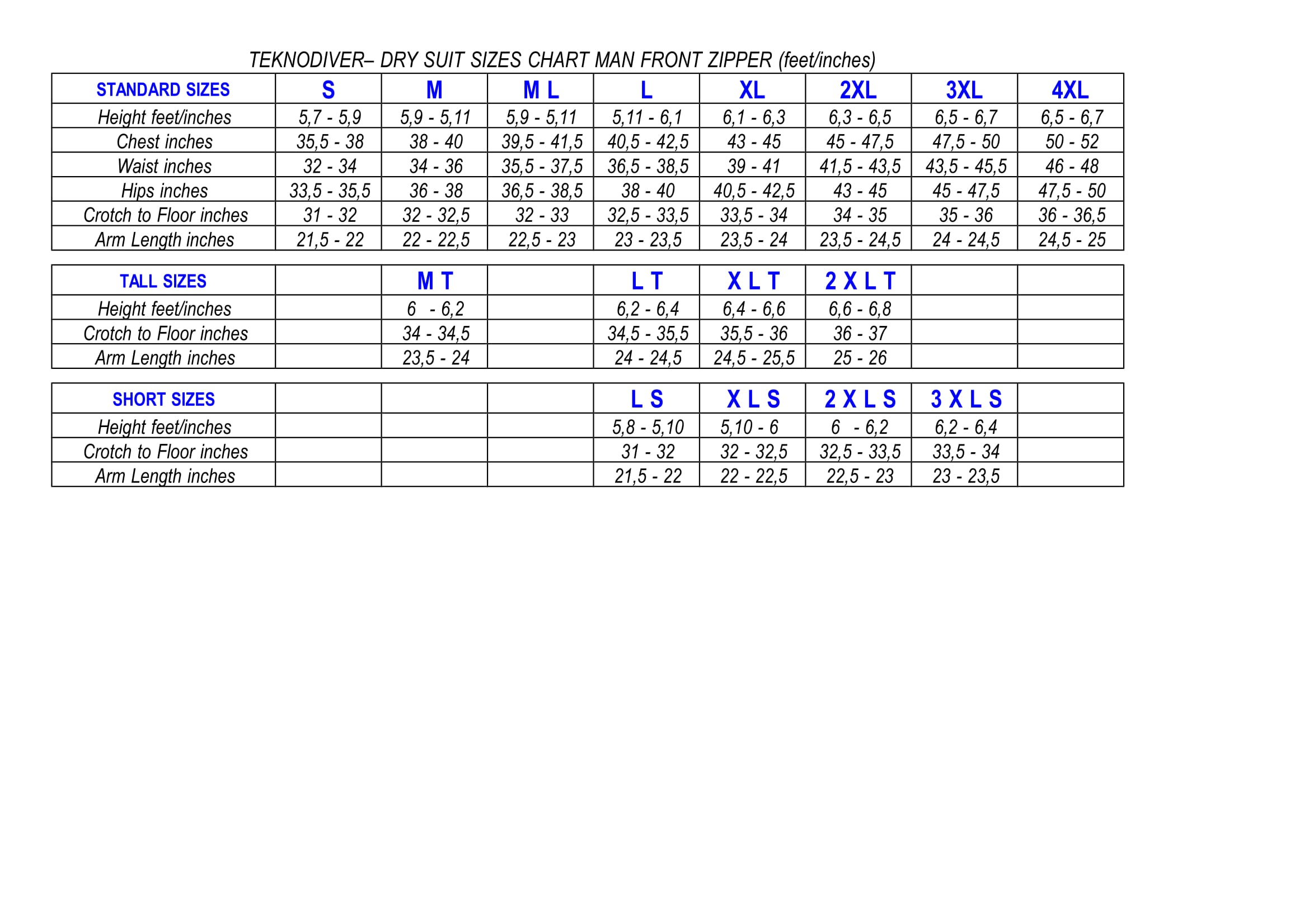 Home » Teknodiver HD Commercial Powertex 750 7.5mm Drysuit » Sizing Chart Dry suit Man Front zipper-1